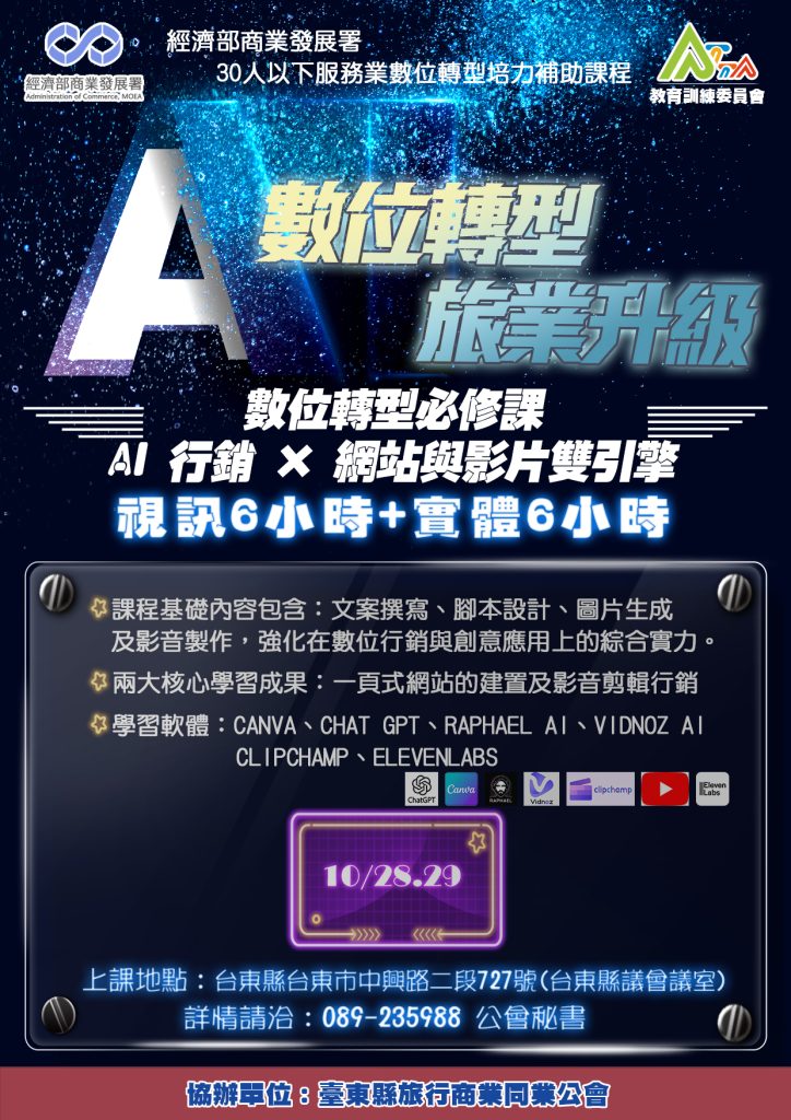 很榮幸受邀前往 台東旅遊同業協會,講授 「經濟部 AI 數位轉型 × 旅遊升級」 課程。本次重點聚焦在 旅遊行銷與宣傳素材的 AI 化產製,協助台東旅遊業者在競爭激烈的市場中,用更快速度、更低成本打造更具吸引力的品牌形象。