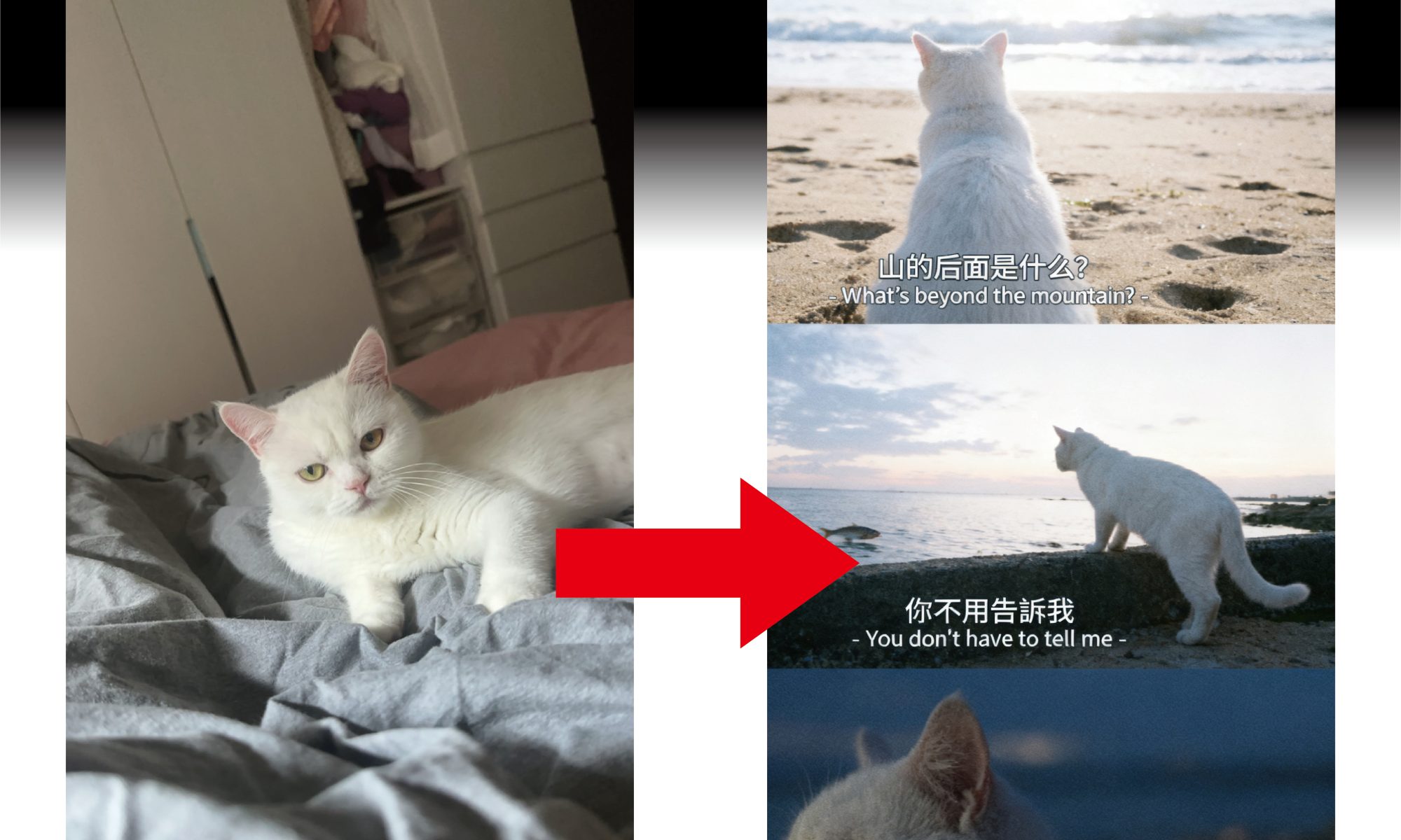 第二張為中景,貓咪側身站立於海邊,看向岸邊的魚,添加中英字幕「你不用告訴我 – You don’t have to tell me -」